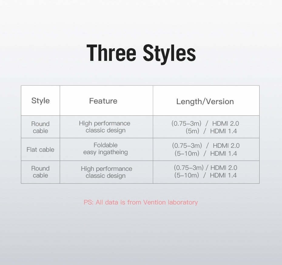 Multiple Styles & Sizes: Offering three unique cable styles (Round Cable, Flat Cable with foldable and easy ingathering capabilities) and available in various lengths (0.75-3m with HDMI 2.0, and 5-10m with HDMI 1.4), you can tailor the choice to fit your specific working environment and device requirements.