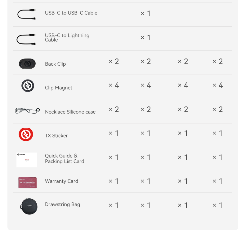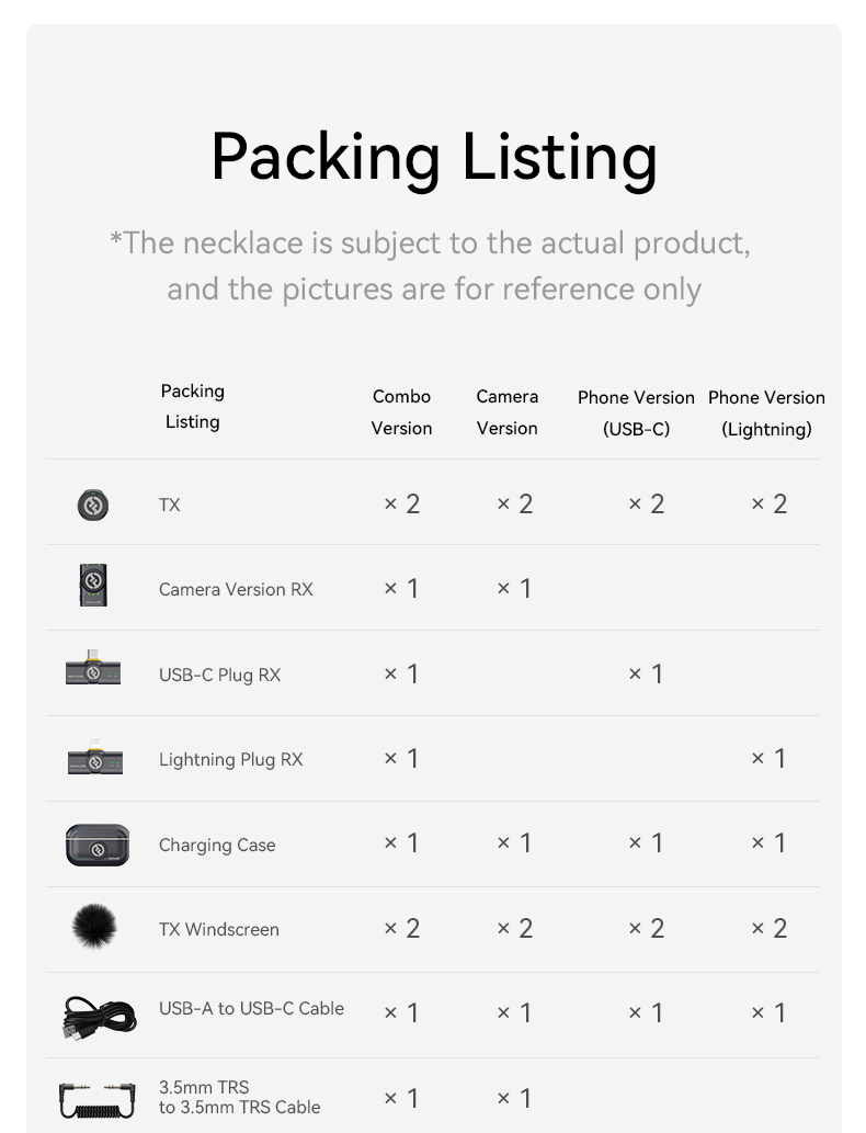 ❖ Less than 1.5h to fully charge the TX and camera version RX, less than 1.5h to charge the mobile version charging case, and less than 2h to charge the camera version charging case;