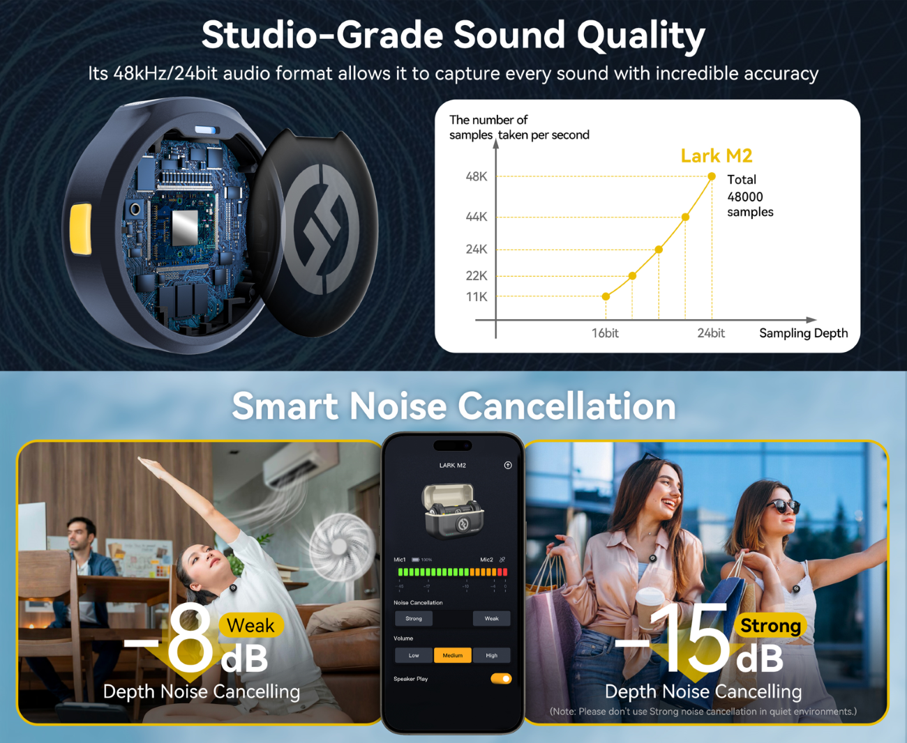 [Hi-Fi Studio-Grade Sound Quality] Designed for the Pro, LARK M2 microphone features a 48kHz/24bit audio format, capturing every sound with accuracy. With a 70dB signal-to-noise ratio, it ensures excellent audio signals with minimal background noise. Moreover, it can handle a Maximum 115dB Sound Pressure Level, perfect for recording in environments with high-pitched sounds.