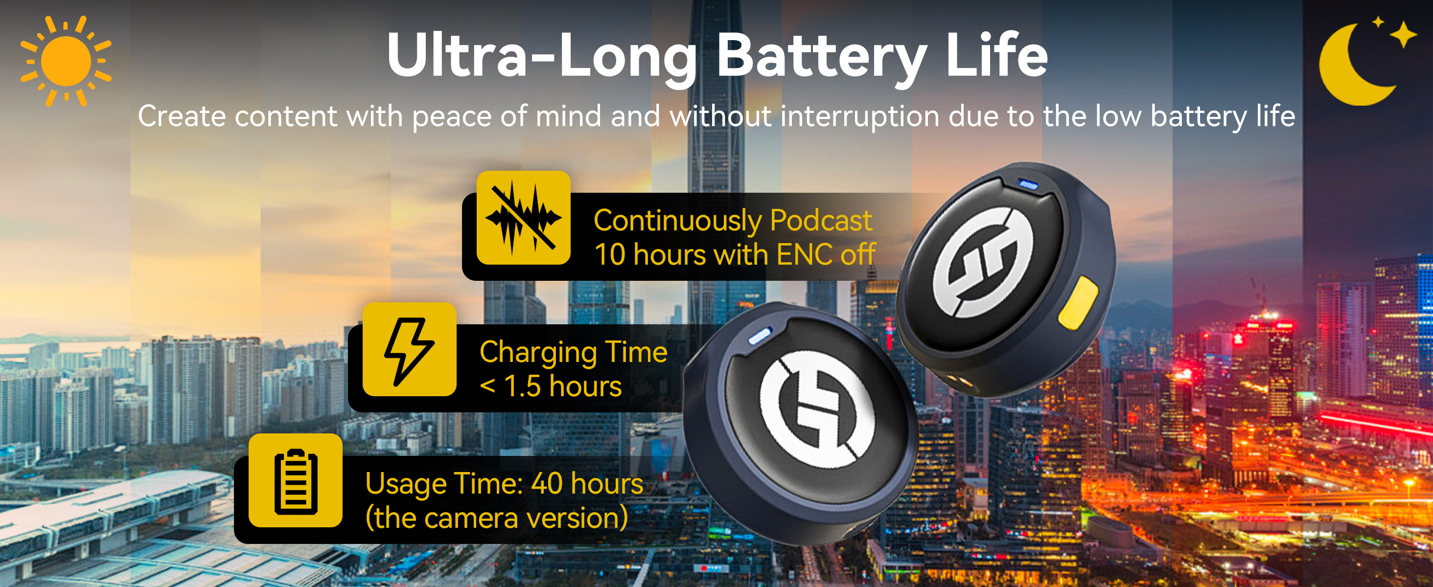 [Extended 40-Hour Battery Life] With optimized power efficiency, the LARK M2 wireless microphone can work for up to 10 hours (with ENC off). The compact charging case can fully charge the entire set twice, and each charge takes less than 2 hours. With the charging case, the camera version has a battery life of 40 hours. No more worrying about low battery situation.