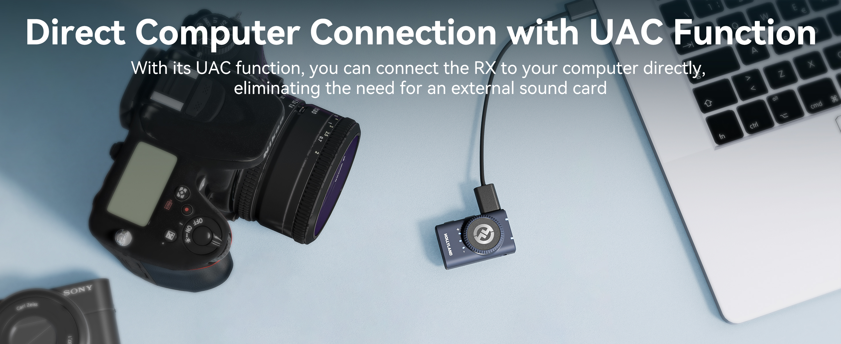 [300m Stable Transmission, Support UAC] LARK M2 is equipped with a superior high-gain LDS antenna that eliminates interference caused by the human body, providing a stable and uninterrupted audio transmission of up to 1000ft/300m LOS range. With its UAC function, you can connect the RX to your computer directly, eliminating the need for an external sound card.