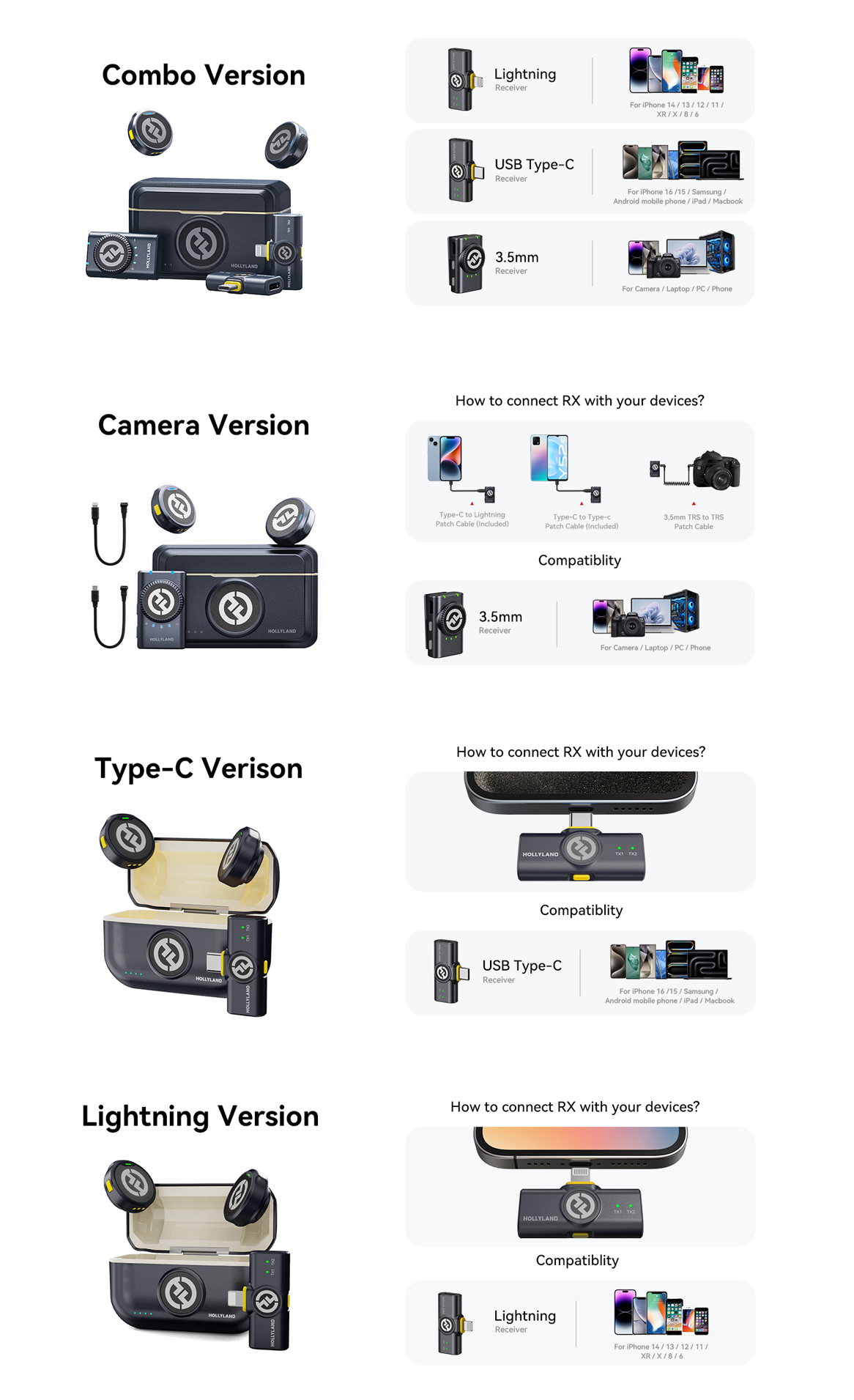 ❖ Ultra-long battery life, TX lasts up to 10h, camera version RX lasts about 9h, and the charging case of the mobile version and camera version can charge TX and RX 2 and 3 times respectively;