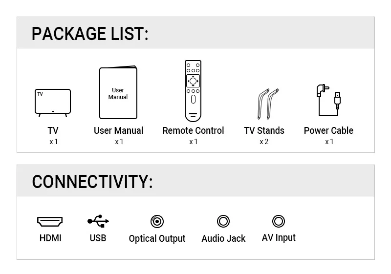 1 AV RF Features Digital DVBT2 Free to Air USB Playback (Movies, Pictures, Music)