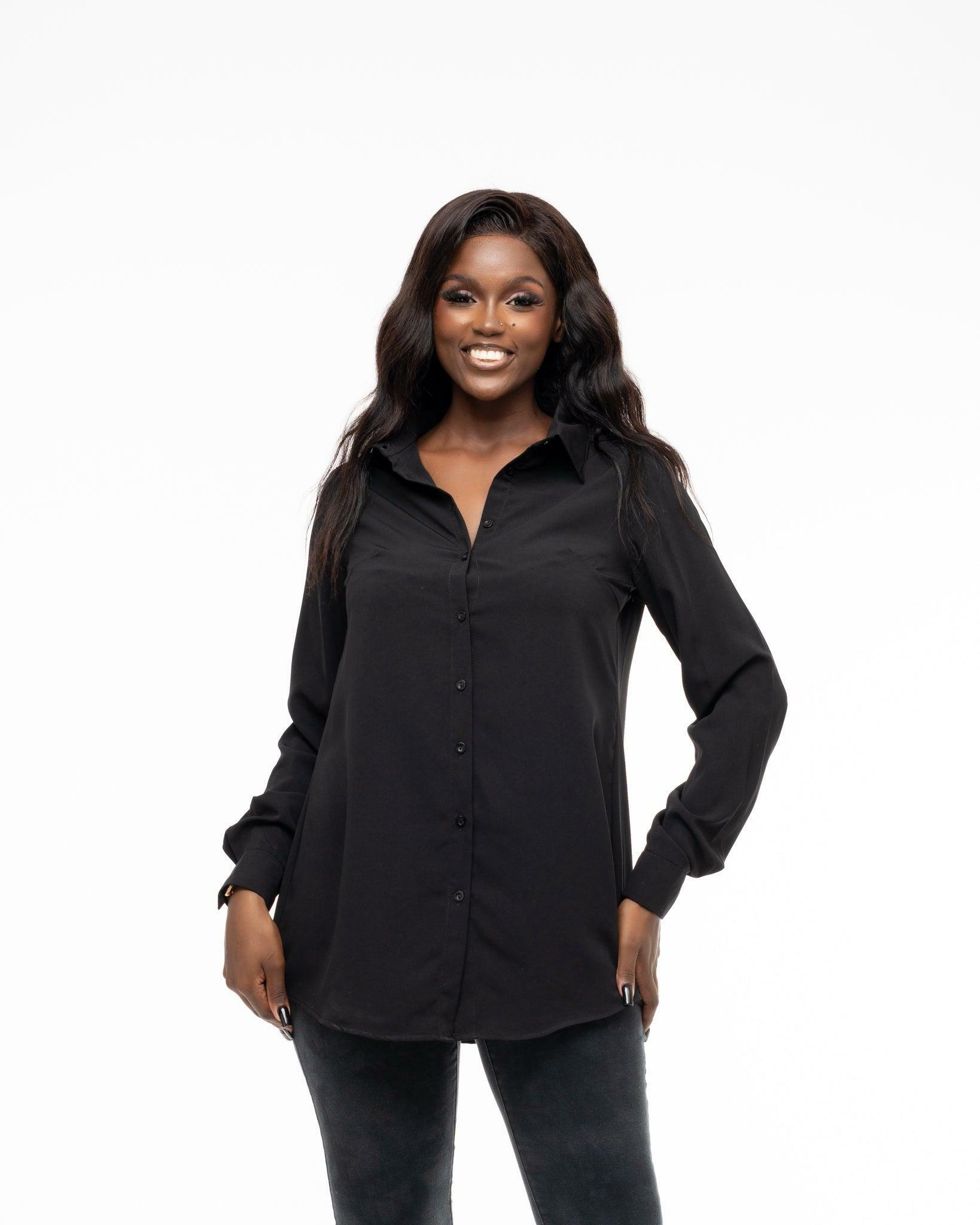 We all need a plain black button up shirt in our closet and this Monarch Shirt in Ebony Black is giving! Made from 100% lightweight soft cotton, the shirt features a full pearl inspired button front and a shirt collar. We absolutely love the full sleeve with a wide cuff for that regal, feminine look that will pair so well with all your bottoms!