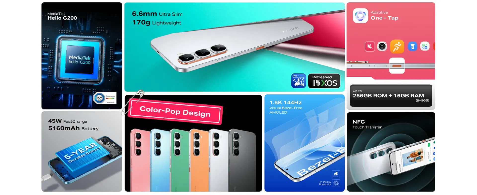 Hot 60 Pro+ features a 6.78-inch IPS LCD with a 120Hz refresh rate, 1300 nits peak, and 1080 x 2436 pixels (~393 ppi density) resolution. Measuring 164.1 x 74.4 x 6.8 mm (6.46 x 2.93 x 0.27 in) and weighing 162g, it is one of the lightest and slimmest smartphones on the market today by Infinix, providing excellent value for its price. Hot 60 Pro Plus runs on Android 14, with up to 1 major Android upgrade, and XOS 14.5 provides a smooth and friendly User Interface. It is powered by an Octa-core Mediatek Helio G100 (6 nm) processor, equally well equipped for multitasking and gaming. The device’s 128GB 8GB RAM and 256GB 8GB RAM anchor it, with the model variants having a microSDXC (dedicated slot) for memory expansion.