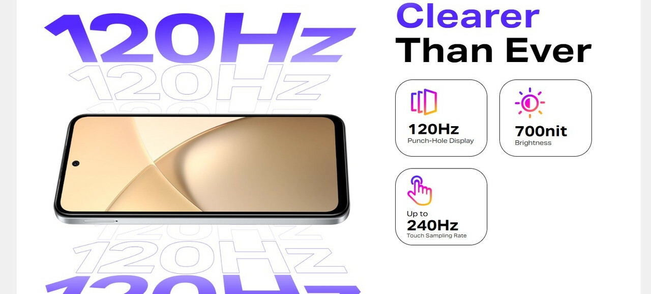6.67″ IPS LCD display at HD+ (720×1600) resolution with a smooth 120 Hz refresh rate and up to 700 nits peak brightness, ideal for sunlight readability
