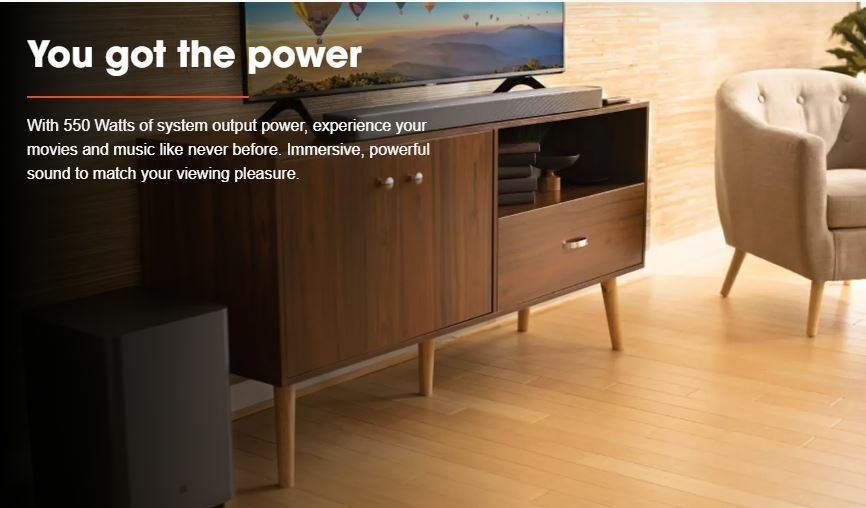 The impressive JBL Bar 5.1 Surround delivers the ultimate home cinematic experience. Bring everything you watch to life with 550 Watts of power and a 10’’ subwoofer: the driving bass of an action movie, the tension of a thriller or the beauty of a nature documentary. Built-in Chromecast and Airplay 2 lets you stream and manage online content, and Bluetooth means your streamed music sounds great, too. Amazing surround sound comes from JBL MultiBeam™ technology. JBL has powered the world’s movie theatres for more than 75 years. Now you can bring that power home.