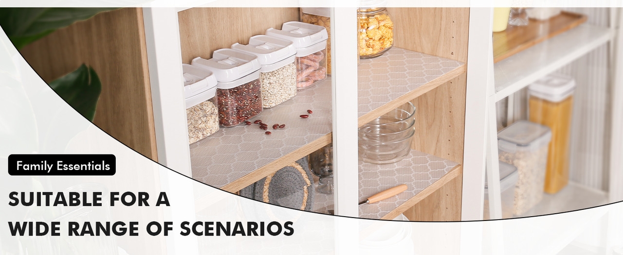 Durable kitchen shelf liner for used as kitchen cabinet liner, shoe shelf liner, desk liners, pantry shelf liner, wire shelves, storage cabinets, desks, drawers, closets, refrigerators. It is also a decent for your mother or friends to show your love for them