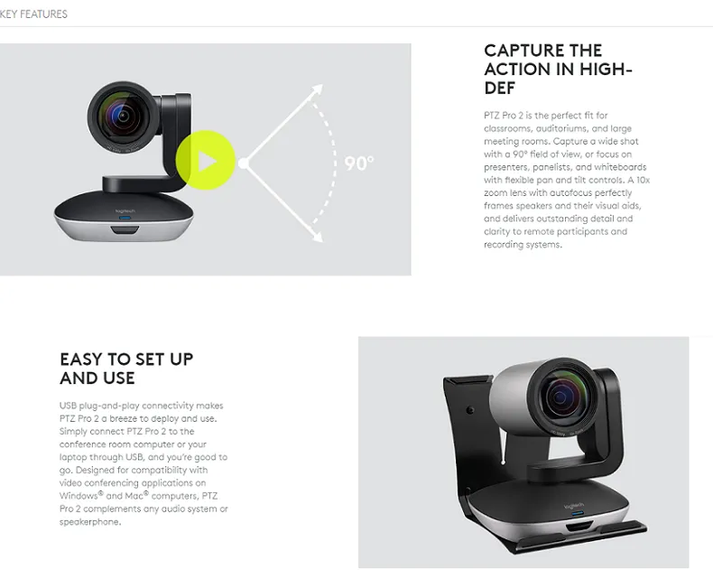 Logitech PTZ Pro 2 delivers premium optics and life-like video to create the experience of sitting together in the same room, even if you are a thousand miles away. Technical improvements accent the camera’s brilliantly sharp image resolution, outstanding color reproduction, and exceptional optical accuracy. At half the price of comparable models, PTZ Pro 2 is clearly the smart choice.