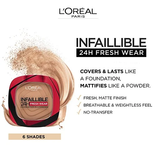 Infallible Up to 24H Fresh Wear Foundation in a Powder’s weightless texture gives full coverage and a natural, matte finish that looks fresh hour after hour. The formula feels breathable and light, leaving skin feeling comfortable for up to 24hrs. This lightweight powder foundation covers like a liquid and mattifies with no cakey look. The longwear formula is oil-free, waterproof, heatproof, sweatproof, non-comedogenic and suitable for all skin types — yes, even acne-prone skin! Get more from your foundation with this lightweight option that’s more affordable and more longwearing than the leading prestige powder!