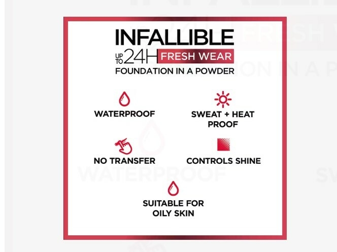 Infallible Up to 24H Fresh Wear Foundation in a Powder’s weightless texture gives full coverage and a natural, matte finish that looks fresh hour after hour. The formula feels breathable and light, leaving skin feeling comfortable for up to 24hrs. This lightweight powder foundation covers like a liquid and mattifies with no cakey look. The longwear formula is oil-free, waterproof, heatproof, sweatproof, non-comedogenic and suitable for all skin types — yes, even acne-prone skin! Get more from your foundation with this lightweight option that’s more affordable and more longwearing than the leading prestige powder!