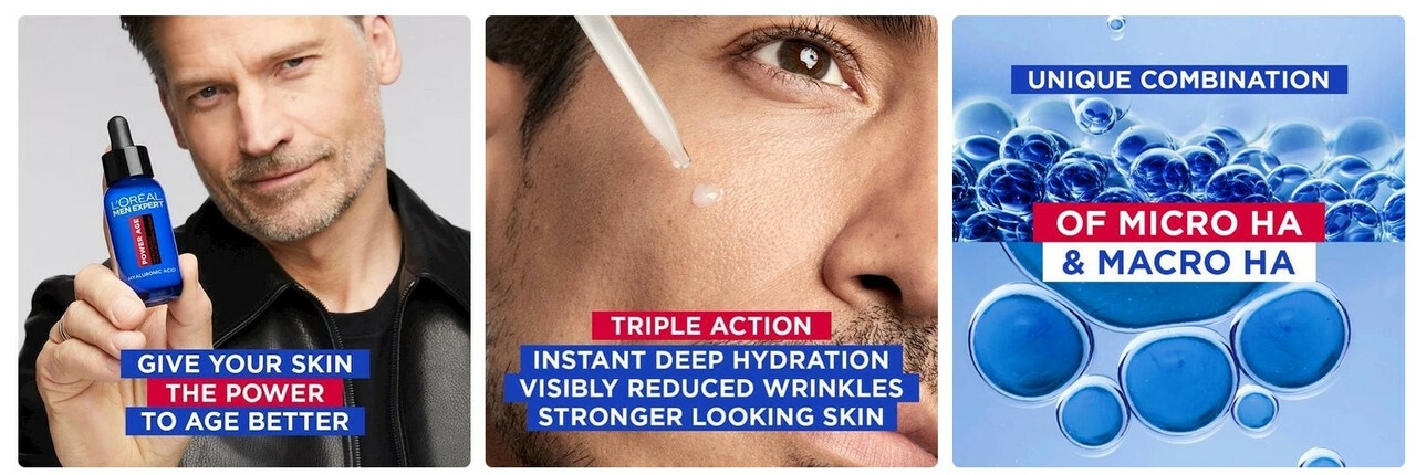 Give your skin the power to age better with L'Oréal Men Expert’s first ever multi-action serum: Power Age Hyaluronic Acid Serum. All the power of a duo of Hyaluronic Acid in an ultra-efficient multi-action serum for men. It smooths, firms and revitalises skin’s appearance, to help reduce the visible signs of ageing and keep skin looking healthy. Power Age Multi-Action Serum targets 3 key signs of early ageing.