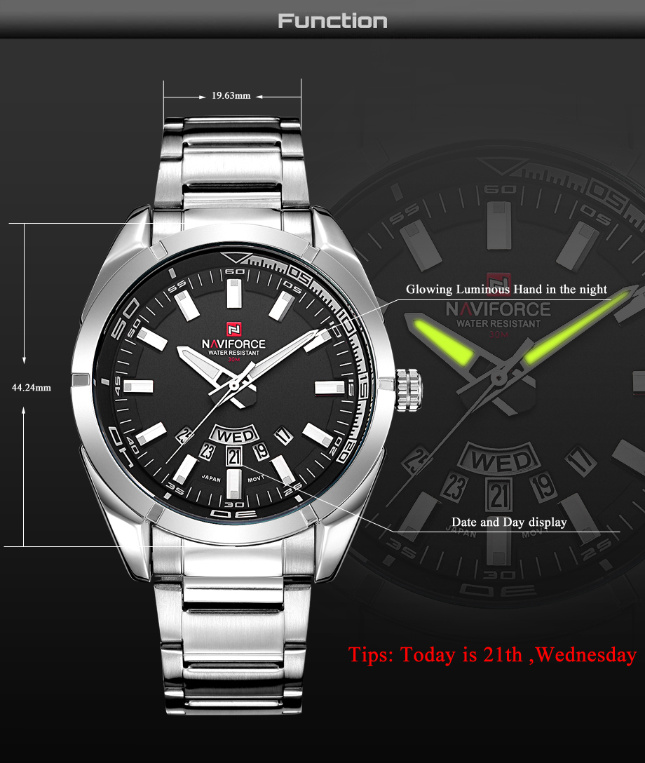 Key FeaturesComplete Calendar,Auto Date,Week DisplayWater Resistant,Shock ResistantScratch-Proof Mineral Glass,Luminous Hands