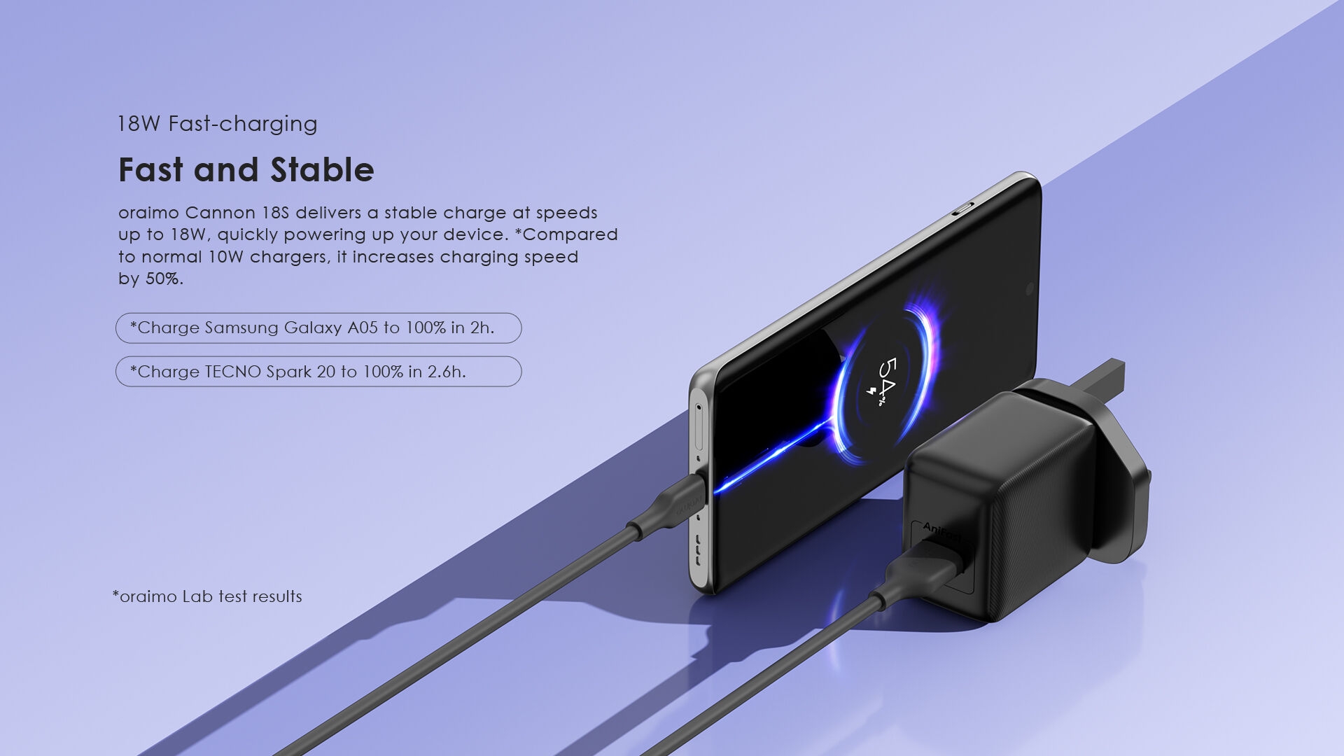 oraimo Can-non 18S delivers a stable charge at speeds up to 18W, quickly powering up your device.