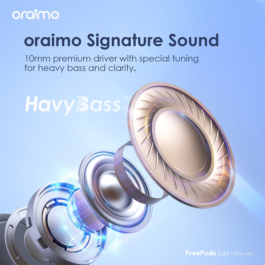 10mm dynamic bass drivers and composite diaphragms take every frequency to the next level. With the exclusive HavyBass™ algorithm, oraimo FreePods Lite delivers crisp, clear high frequencies and deep, rich bass, making every sound come to life more than ever.