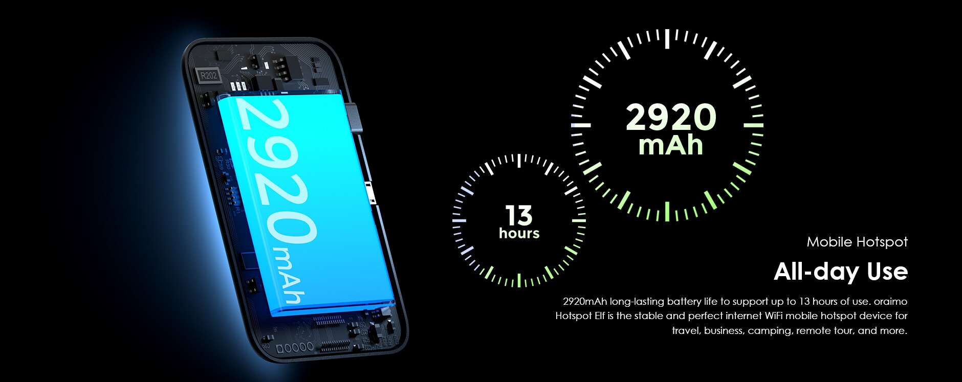 2,920mAh long-lasting battery life to support up to 13 hours of use. oraimo Hotspot is the stable and perfect internet WiFi mobile hotspot device for travel, business, camping, remote tour, and more.