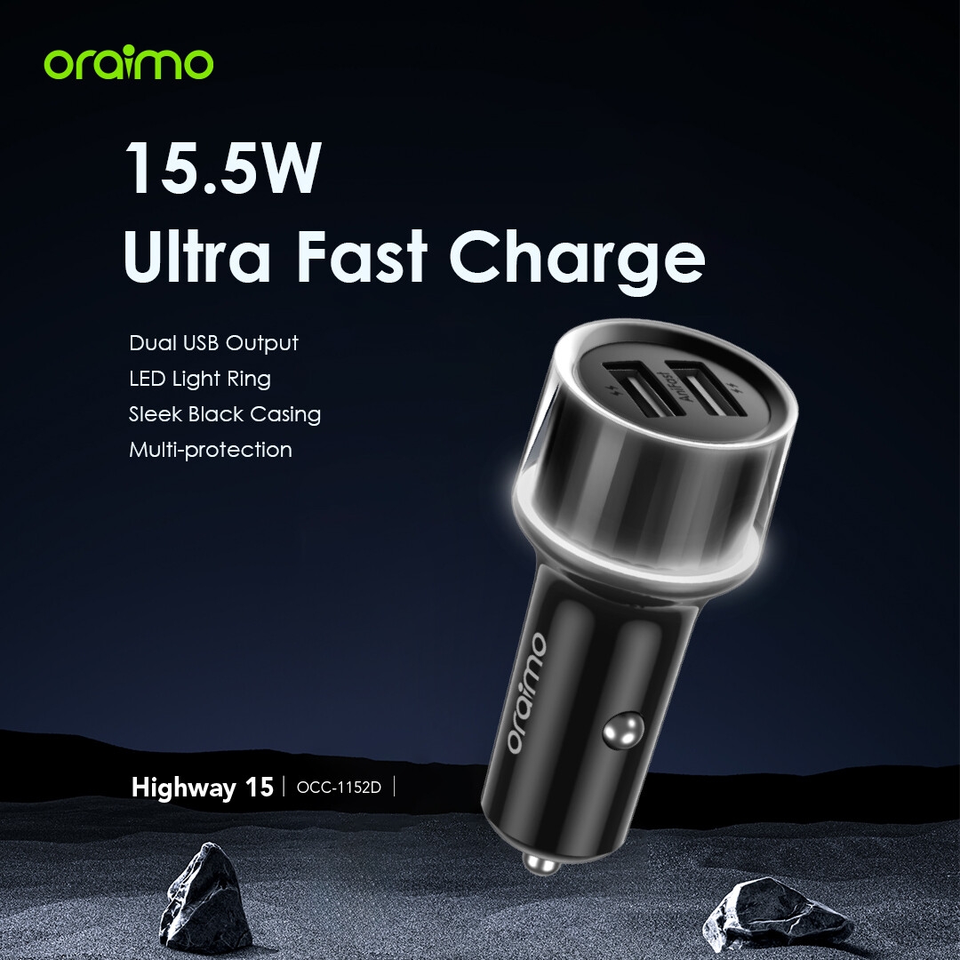 Oraimo Highway 15 15.5W Car Charger with 3-in-1 Cable with Dual USB Output, LED Light Ring,Sleek Black Casing & Multi-Protection Safety SystemKSh 1,000Add to cart