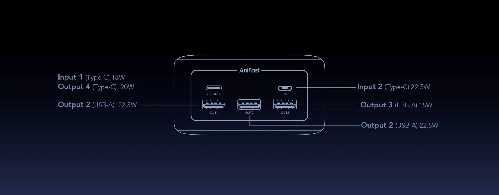 Output 4(Type-C): 5V ⎓ 3A, 9V ⎓ 2.2A, 12V ⎓ 1.75A;