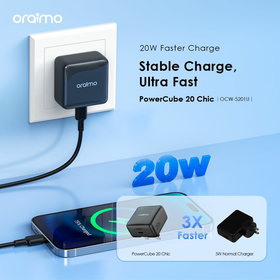 oraimo PowerCube 20 Chic offers 20W stable and fast charging, which is 3 times faster than a normal 5W charger, ensuring your device rapidly reaches full charge.