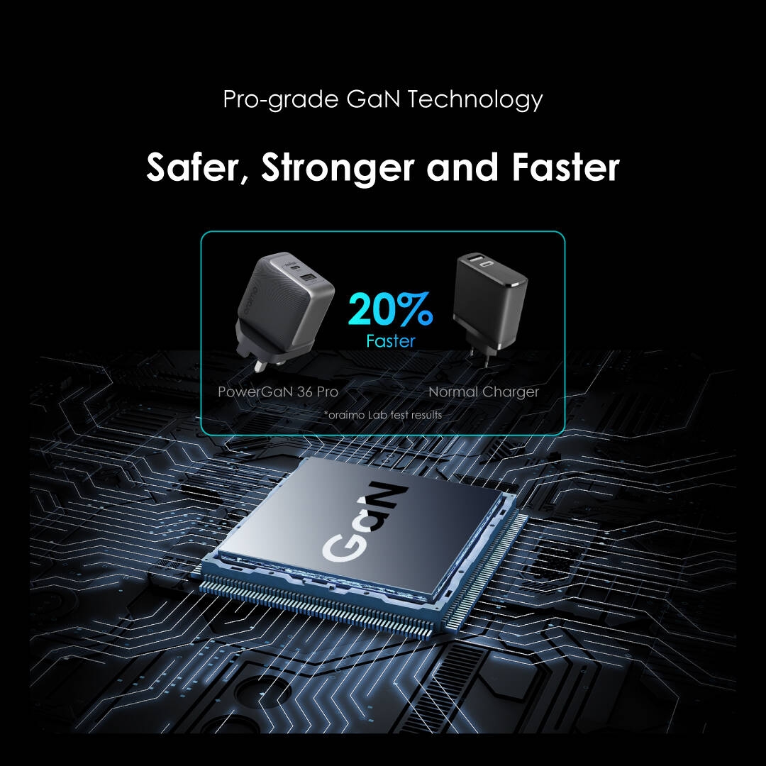 oraimo PowerGaN 36 Pro enables your device to reach a full charge in a flash. Equipped with a 60W Type-C fast charging cable, it can safely charges multiple devices.