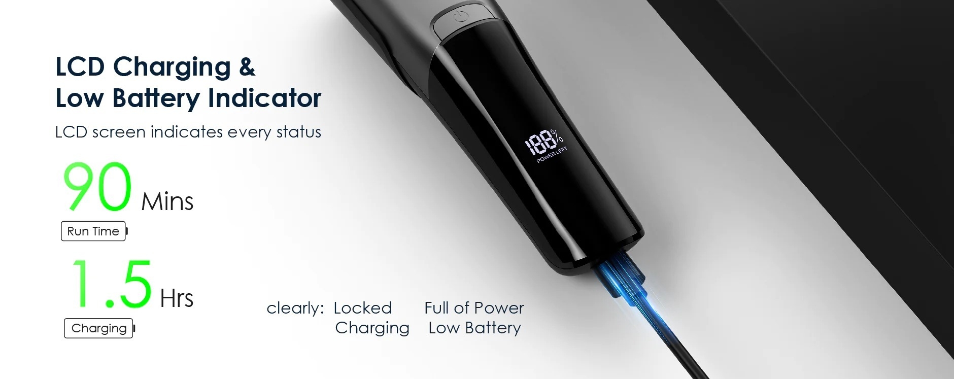 It is equipped with overcharge and over discharge protection, and an LED light indicates whether the trimmer is filled with power, charging, or has a low battery.