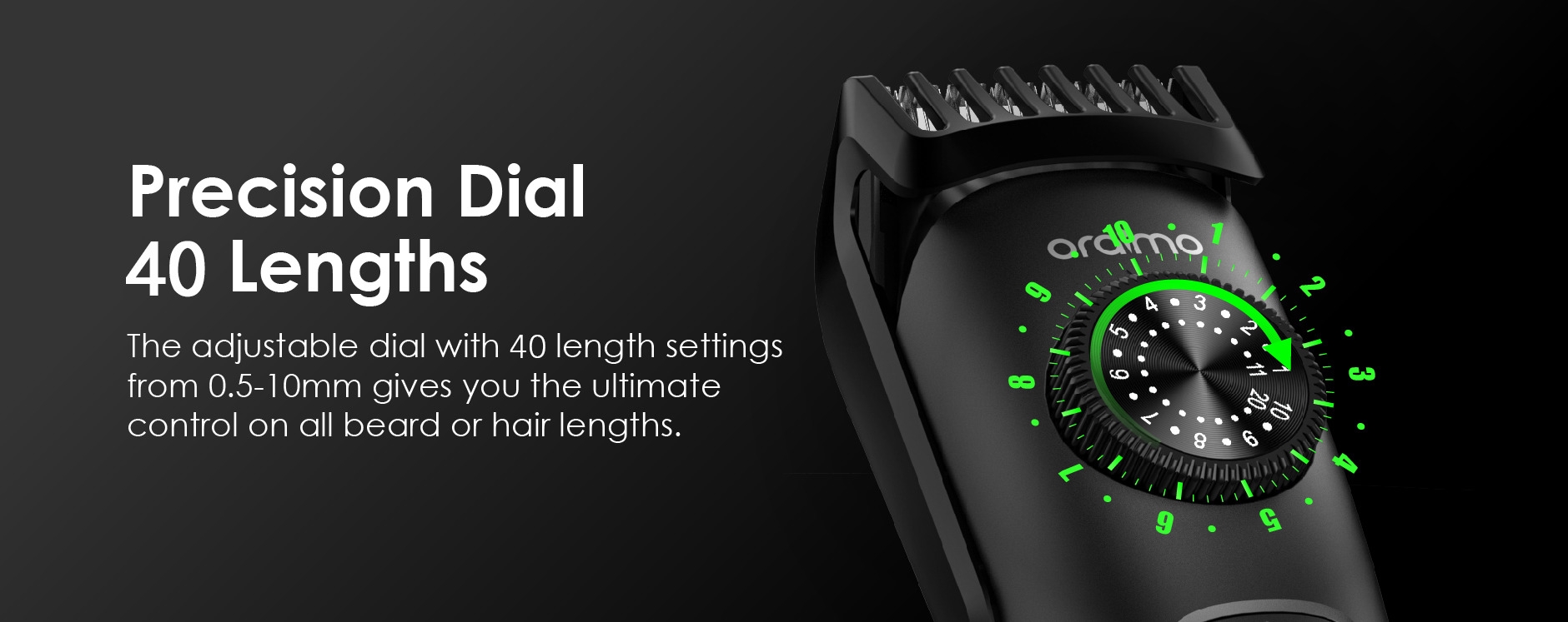 The precision dial offers 40 length settings from 0.5-10mm for any beard or hair style. Adjusting the thinning length button to shave your beard and mustache according to your own expected thickness of your beard.