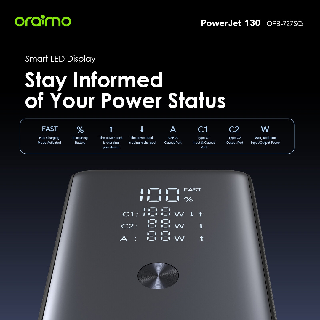 oraimo PowerJet 130 can also work with low-current devices. Just press the Power Button twice to activate the low-current mode to charge your smartwatch, earphones, and headset.