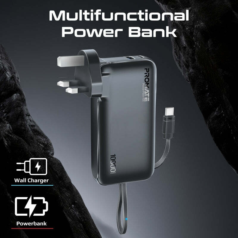 Streamline your on-the-go charging experience with the PowerPack-10C by Promate, the ultimate ultra-compact wall charger and power bank. Boasting a powerful 10000mAh battery capacity and a sleek design, this versatile charging solution features a 20W USB-C in/out port, a 22.5W QC3.0 USB-A output port, built-in 20W USB-C output cable and an integrated USA 2-pin AC plug, plus 2-pin EU and 3-pin UK plug adapters for international AC charging in over 195+ countries. The AC/DC dual mode charging input ensures versatility, while the simultaneous charge and discharge feature keeps your devices powered up without interruption. With automatic voltage regulation and a robust multi-protection system safeguarding against overcharge, over discharge and over-heating you can trust the PowerPack-10C to deliver reliable and efficient charging. Plus, the intuitive digital display keeps you informed of your power status at a glance. Power up with confidence and convenience with Promate’s PowerPack-10C.