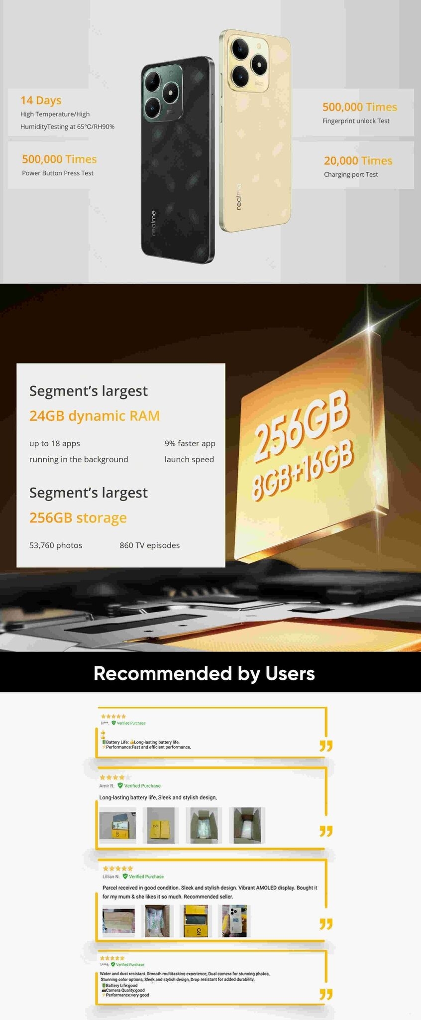 Introduce Realme C61, a smartphone designed specifically for seamless performance and stunning visual effects. This phone features a 6.74-inch IPS LCD large display with a smooth 90Hz refresh rate and 560 nits peak brightness, ensuring a vivid and smooth viewing experience. The display resolution of 720 x 1600 pixels provides clear and delicate images, allowing you to enjoy the pleasure of media consumption. The Realme C61 is equipped with the Unisoc T612 chipset and an eight core CPU, providing reliable performance for multitasking and daily use. Equipped with 6GB RAM and 128GB internal storage, which can be expanded through a dedicated microSDXC slot, you have enough space to store applications, photos, and videos. Capture your exciting moments with a 50 MP rear camera, complemented by auxiliary lenses to enhance the photography effect. The front 5 MP camera ensures clear selfies and clear video calls. Both cameras support video recording, and the rear camera also supports it 1080p@30fps , front camera support 720p@30fps The Realme C61 is equipped with a powerful 5000 mAh battery that can be used for a full day. With 15W wired charging, you can quickly charge and stay connected. This device supports dual SIM card functionality and 4G LTE for seamless connectivity, as well as Wi Fi 802.11 a/b/g/n/ac and Bluetooth 5.0. The Realme C61 is designed to meet daily challenges and features IP54 dust and splash protection. It also includes a side mounted fingerprint sensor to enhance security and convenience. The 3.5mm headphone jack allows you to easily enjoy your favorite music and calls.