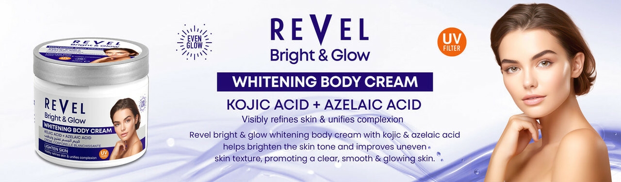 Revel bright & glow whitening body cream with kojic & azelaic acid helps brighten the Skin tone and improves uneven skin texture, promoting a clear, smooth & glowing skin