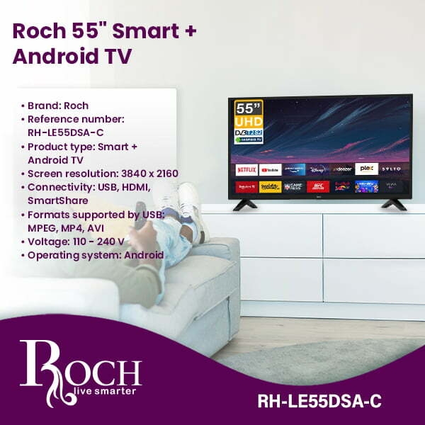 Enhance your home entertainment setup with the Roch 55″ Smart + Android TV and immerse yourself in a world of endless viewing possibilities entertainment. Whether you’re relaxing after a long day or hosting a movie night with friends, this TV promises an immersive viewing experience that will captivate and delight.