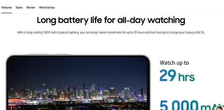 The Galaxy A56 5G’s 5,000mAh battery lasts at least 1.5 days under typical use, ensuring you stay productive throughout the day. The 45W fast charger allows quick refueling of the handset, keeping you up and running when communicating, shooting videos, gaming, browsing the internet, and consuming content. Charge 0-65% in 30 minutes and 0-100% in 68 minutes, so you can get back to what you love without long waits.