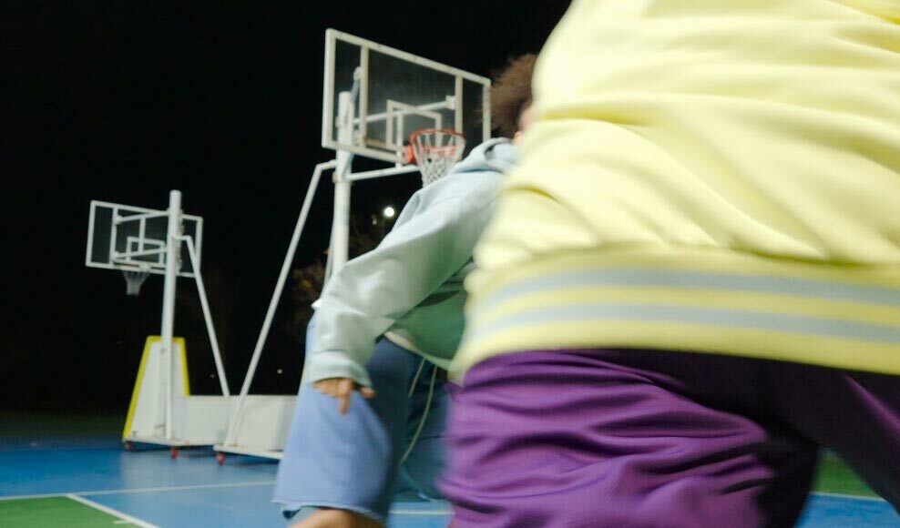 Two subjects play basketball in the evening. The footage is clear thanks to Galaxy S25 plus's camera.