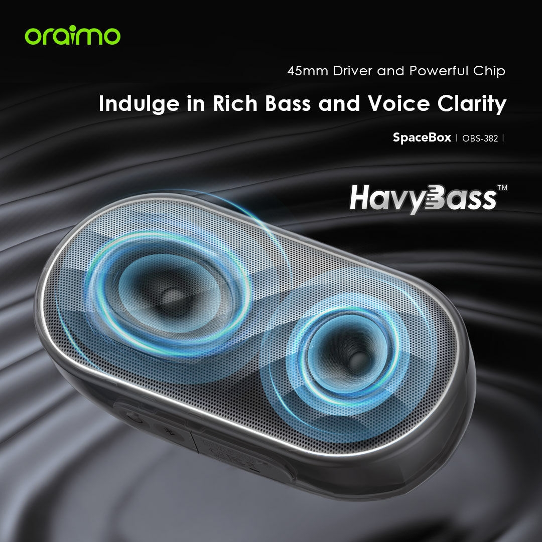 The oraimo SpaceBox delivers powerful oraimo Pro Sound with impactful bass in a compact design, featuring professional acoustic engineering and exclusive HavyBass™ technology.