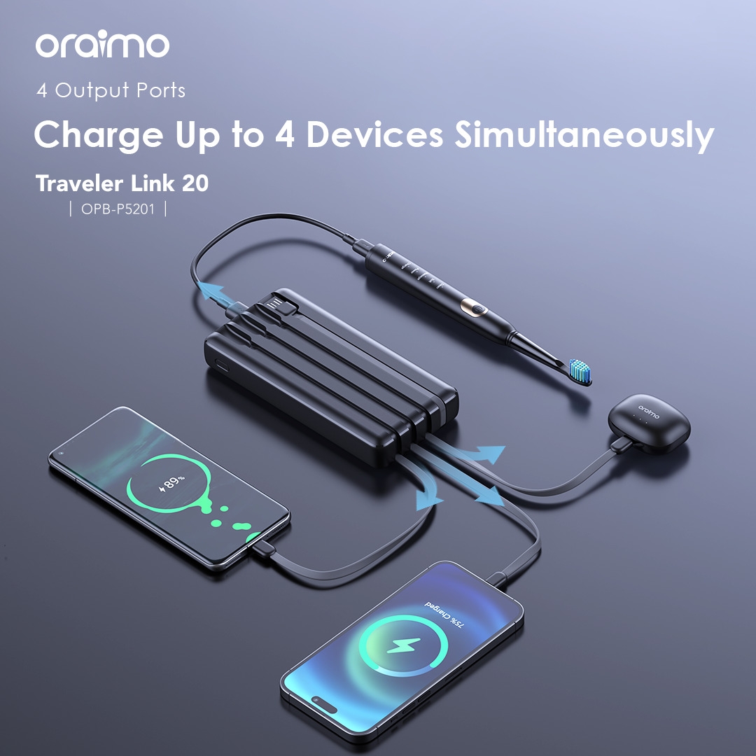 Traveler Link 20 is equipped with 3 built-in charging cables and 1 USB-A port, Traveler Link 20 can simultaneously deliver power to 4 devices at a speed of up to 12W.