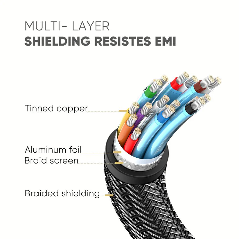 26AWG Tinned copper with triple-layer shielding to resist interference and ensure stable signal transmission. Durable and thickening SPCC shell, nylon braided material and Gold-plated connectors to ensure a superior durability and functionality under heavy usage.