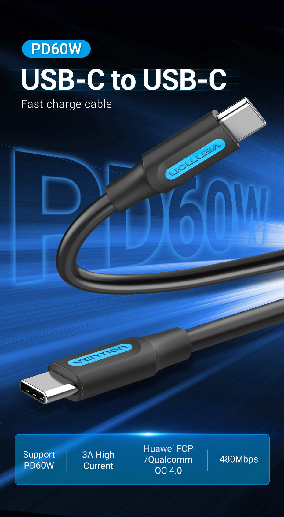 Support PD60W - 3A High Current - Huawei FCP/Qualcomm QC 4.0 - 480Mbps