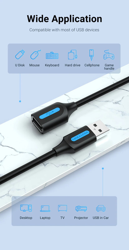 • Wide Application: Compatible with most of USB devices. For example: U disk/mouse/key board/hard drive/cellphone/game handle/desktop/laptop/TV/projector/USB in car/car DVR