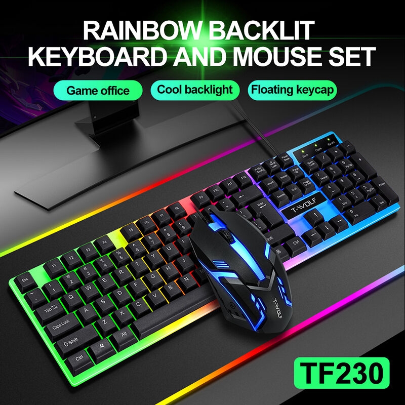 :The T-WOLF TF230 Gaming Keyboard and Mouse Set features a 104-key full-size keyboard with LED backlighting, wrist support, and multimedia function keys, offering both comfort and functionality for gaming and office use. Its wired USB connection ensures reliable performance, while the waterproof design adds durability. The ergonomic design supports human engineering, enhancing user experience during extended use.