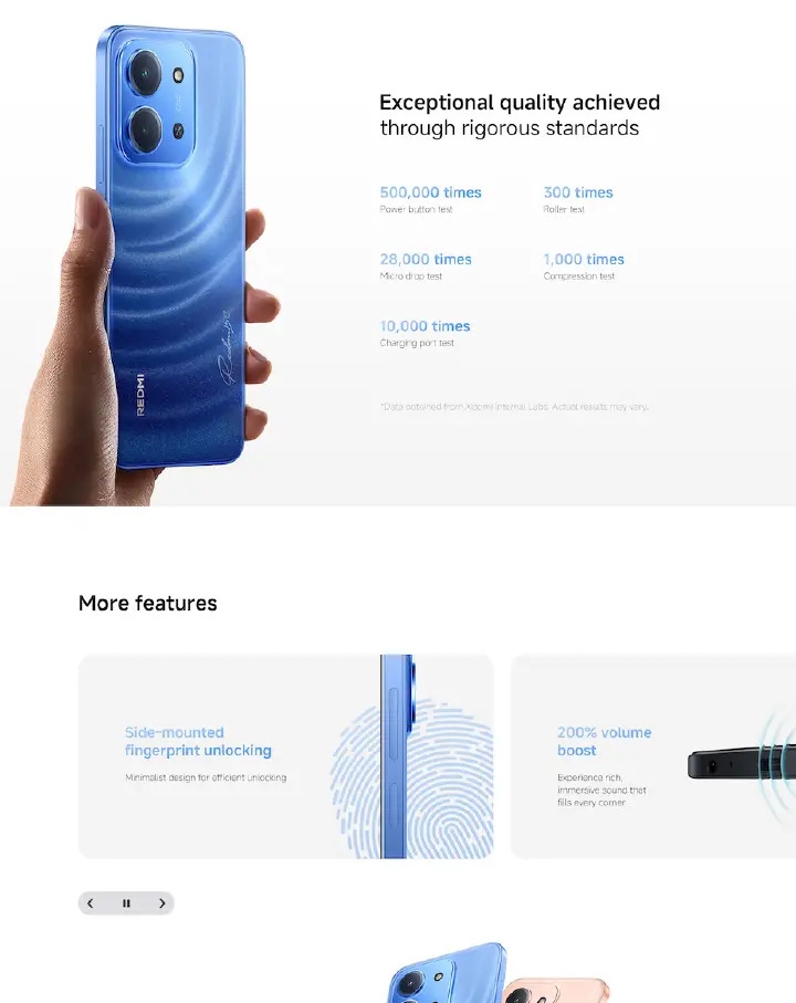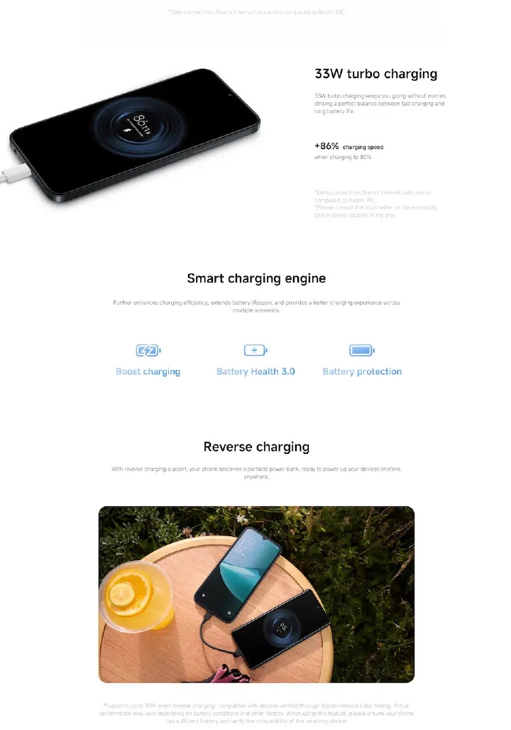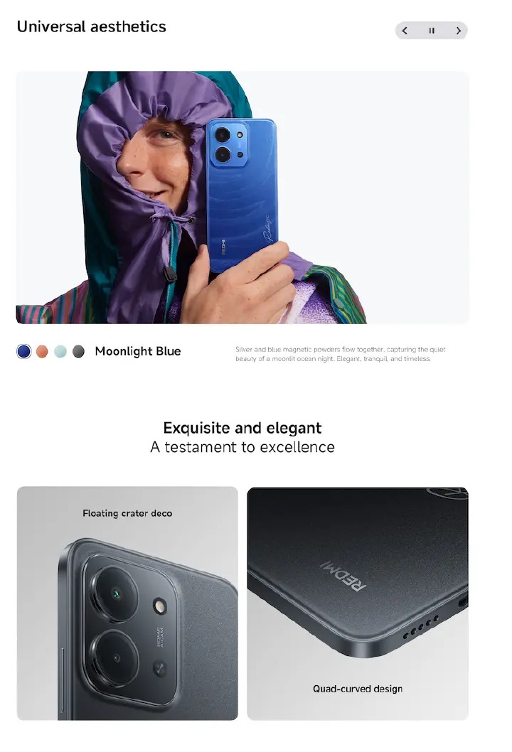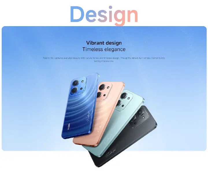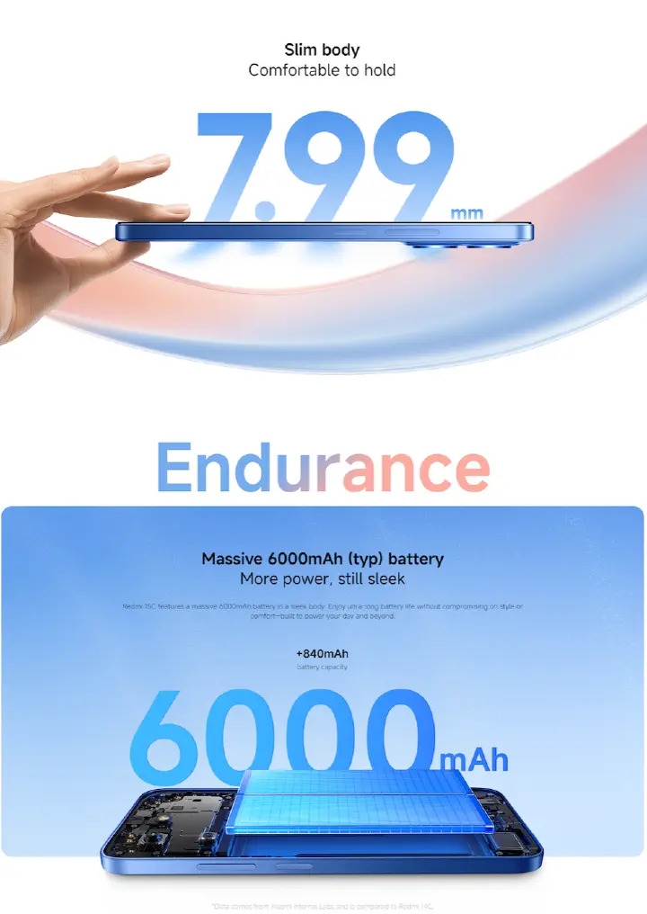 Key FeaturesRAM: 6GBInternal Storage: 128GBDisplay: 6.9-inch IPS LCDOS: Android 15, HyperOS 2Chipset: Mediatek Helio G81 Ultra (12 nm)Main Camera: 50MP + QVGASelfie Lens: 8MPConnectivity: 4G, Wi-fi, 3.5mm jack port, Bluetooth 5.4, NFC,Battery: 6,000mAh, 33W.