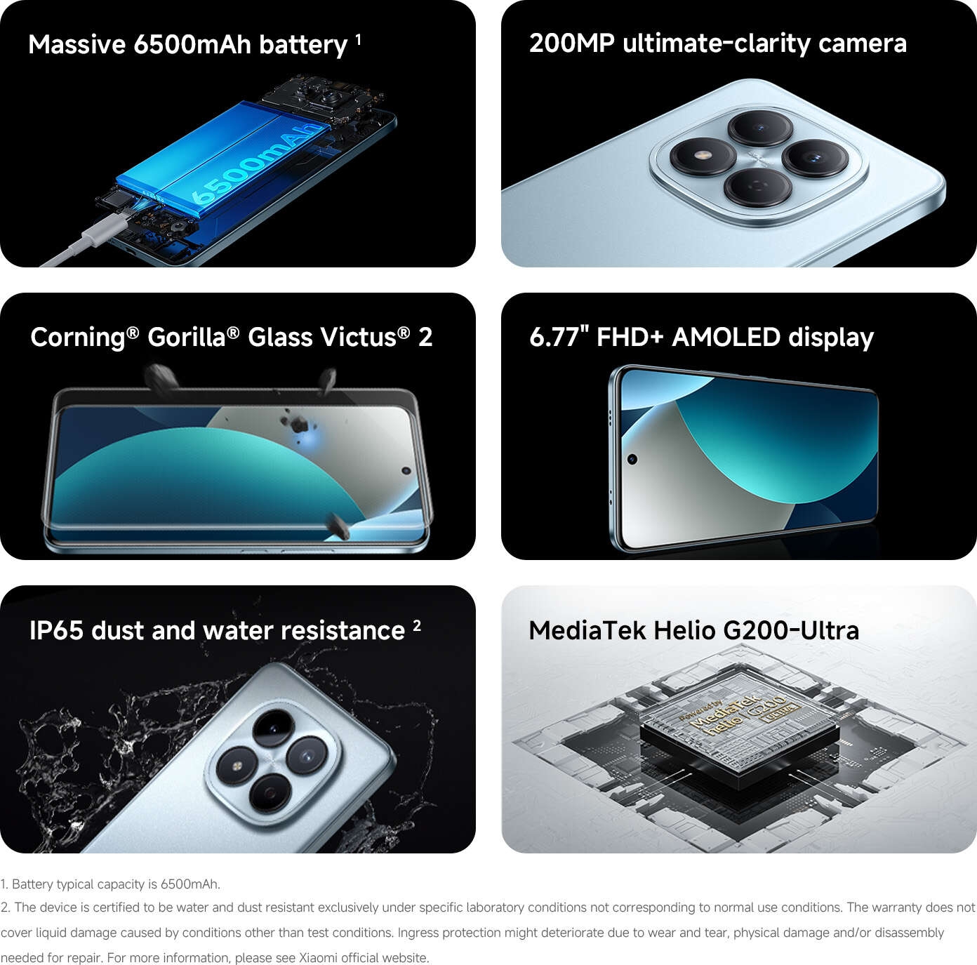 - IP65*The device is certified to be splash and dust resistant exclusively under specific laboratory conditions not corresponding to normal use conditions. The warranty does not cover liquid damage caused by conditions other than test conditions. Ingress protection might deteriorate due to wear and tear, physical damage and/or disassembly needed for repair. For more information, please see Xiaomi official website.