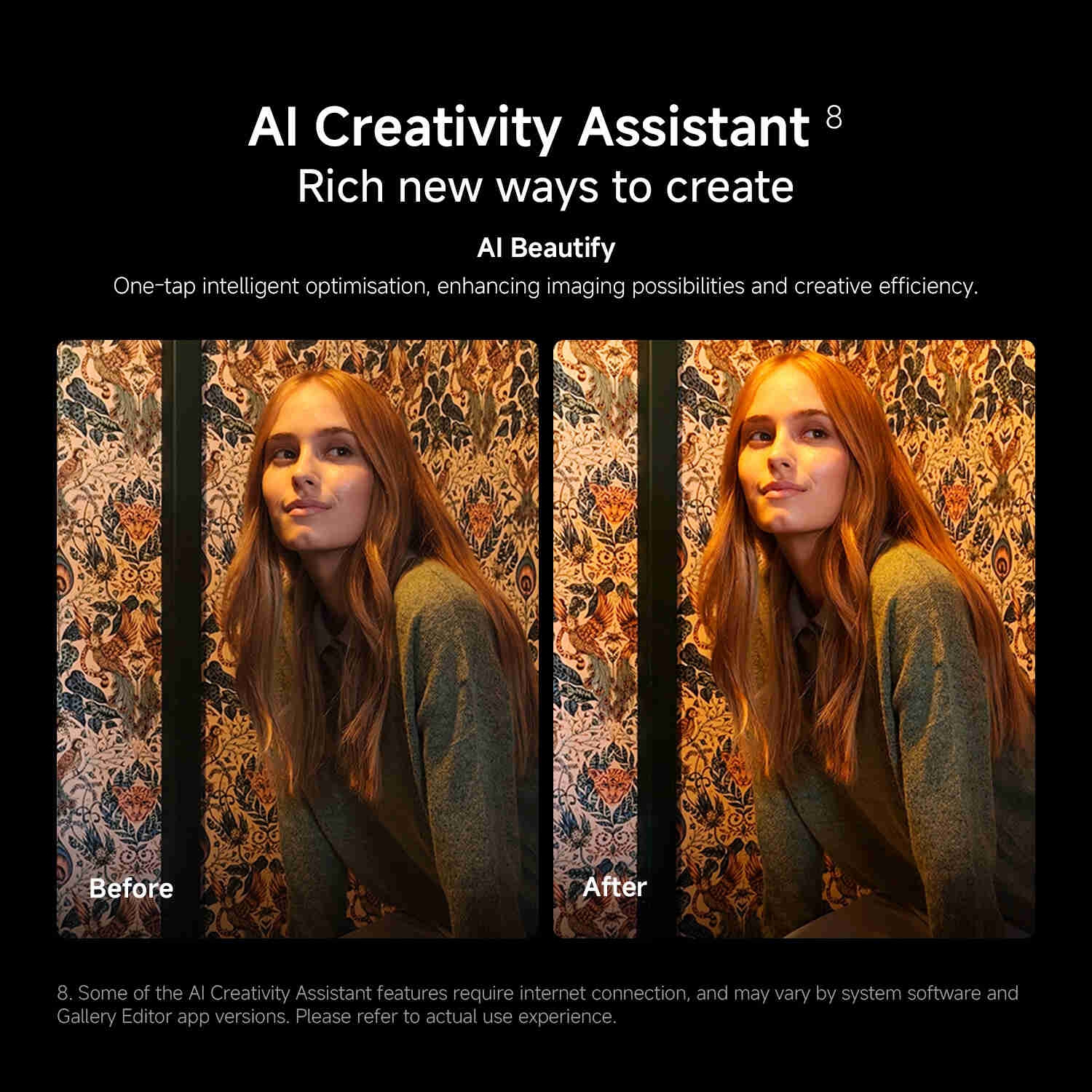 AI Erase Pro, AI Remove Reflection, AI Image Expansion, AI Sky, AI Bokeh, AI Image Enhancement, AI Beautify, AI Film, Circle to Search with Google, Google Gemini*Availability of AI features may vary based on region. Please check official website for more information. *Some of the AI Creativity Assistant features require internet connection, and may vary by system software and Gallery Editor app versions. Please refer to actual use experience. *Available on select devices and internet connection required. Works on compatible apps and surfaces. Results may vary depending on visual matches. Google is a trademark of Google LLC. *Google and Gemini are trademarks of Google LLC. Check responses. Setup required. Compatibility and availability varies.