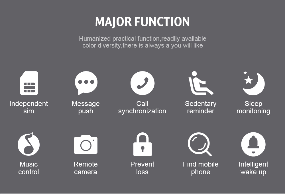 Pedometer, Step motion meter, Calories calculation, Sports mileage records, Sedentary remind, Sleep monitoring, Remote photos, Alarm clock, Calendar, Notification remind, Time synchronization